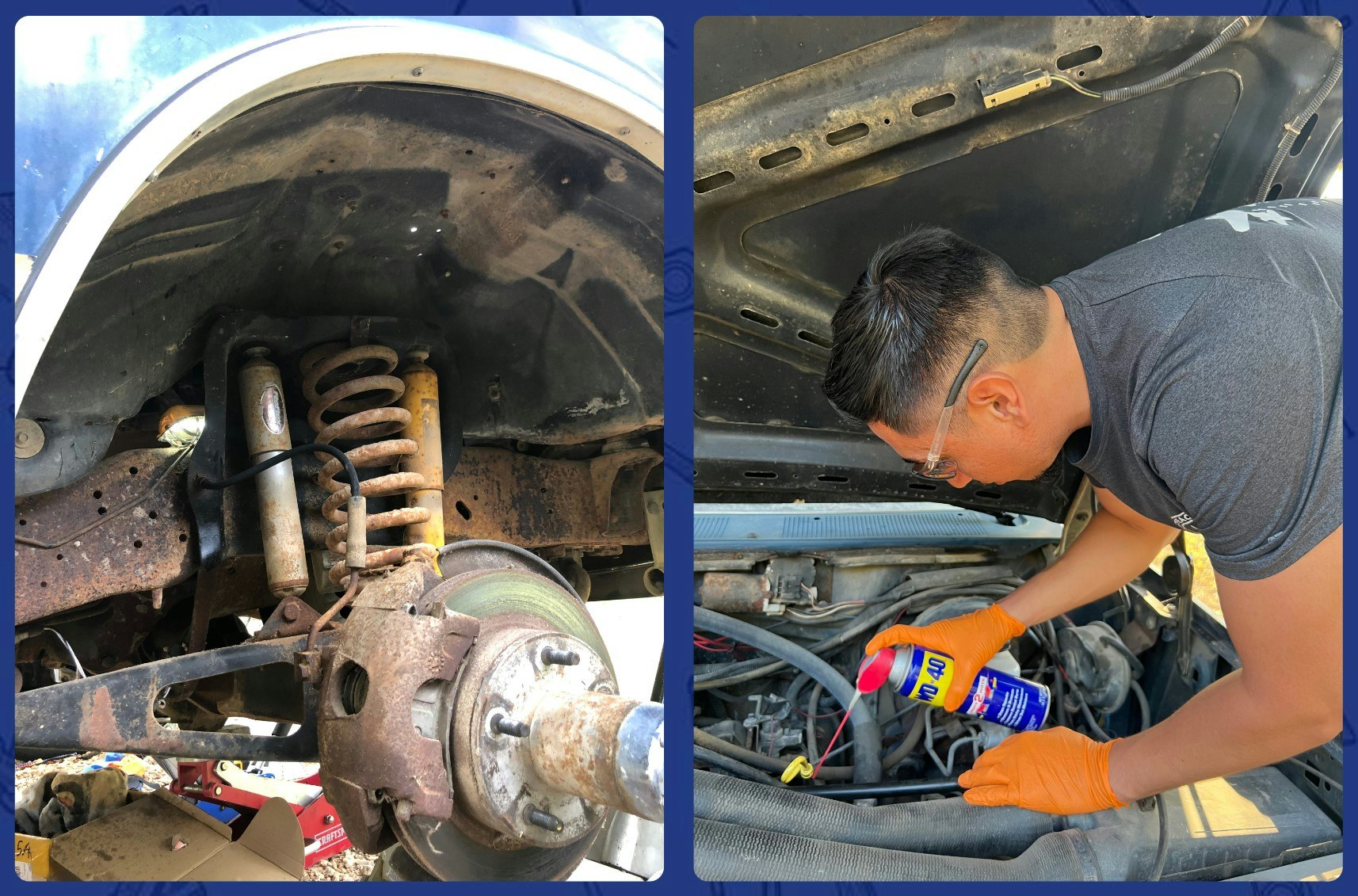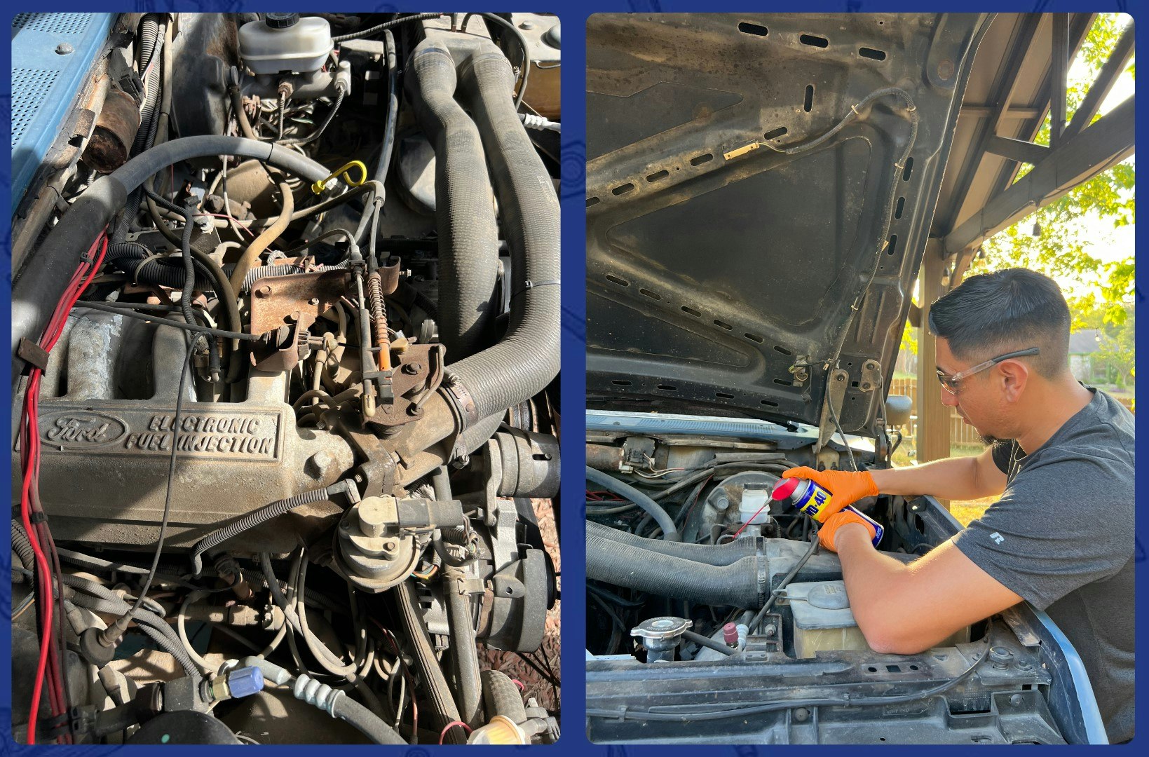 To check if the project would be feasible, Bryan had to see if the engine could function. “I used 2 cans of WD-40 to fill up 8 cylinders and let it sit overnight,” says Bryan. “The next day I manually turned the engine over and it was free and not locked.” The fuel tank also needed to be dropped and replaced, and thanks to WD-40 Multi-Use Product Bryan “was able to remove the shield covering the tank which the nuts were rusted tight on the studs.”