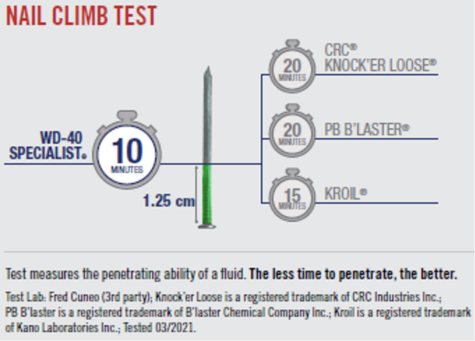 As you can see, this nail climb test measures the penetrating ability of a fluid. In this case, a rust prevention spray and penetrant. The rust penetrant that works in the least amount of time wins the nail test. The results show that the rust prevention spray - WD-40 Specialist Penetrant w/ EZ REACH - works in just 10 minutes, while Kroil takes 15 minutes to act. PB B'laster® and CRC® Knock'er Loose® both have fun brand names, but in the end, they both take 20 minutes to do their job while WD-40 Specialist Penetrant w/ EZ REACH takes just 10 minutes.