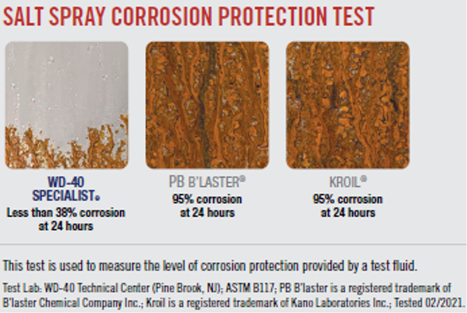 ** Test Lab: WD-40 Co. Technical Center (Pine Brook, NJ); ASTM B117; Test date: 02/2021.