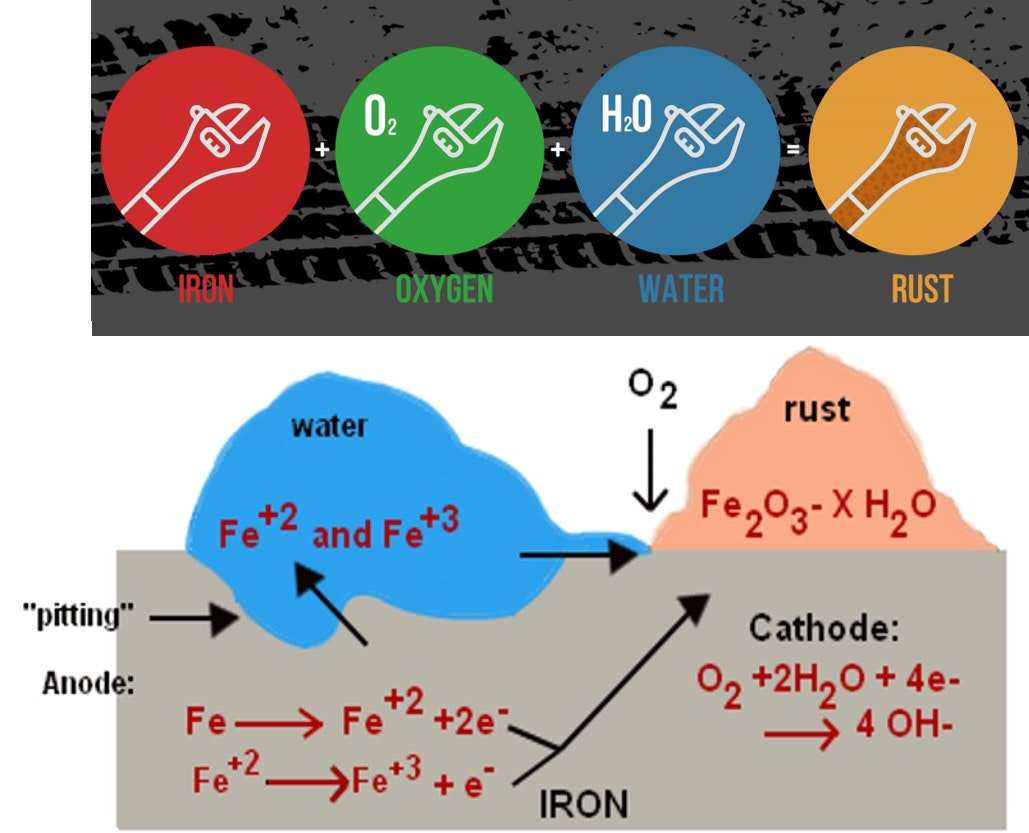 The oxygen atoms steal electrons from the iron, causing a chemical reaction that creates ferric oxide or rust. Rust is the most common term for corrosion of iron and its alloys, like steel. Another term you might have heard referring to this process is called oxidation.