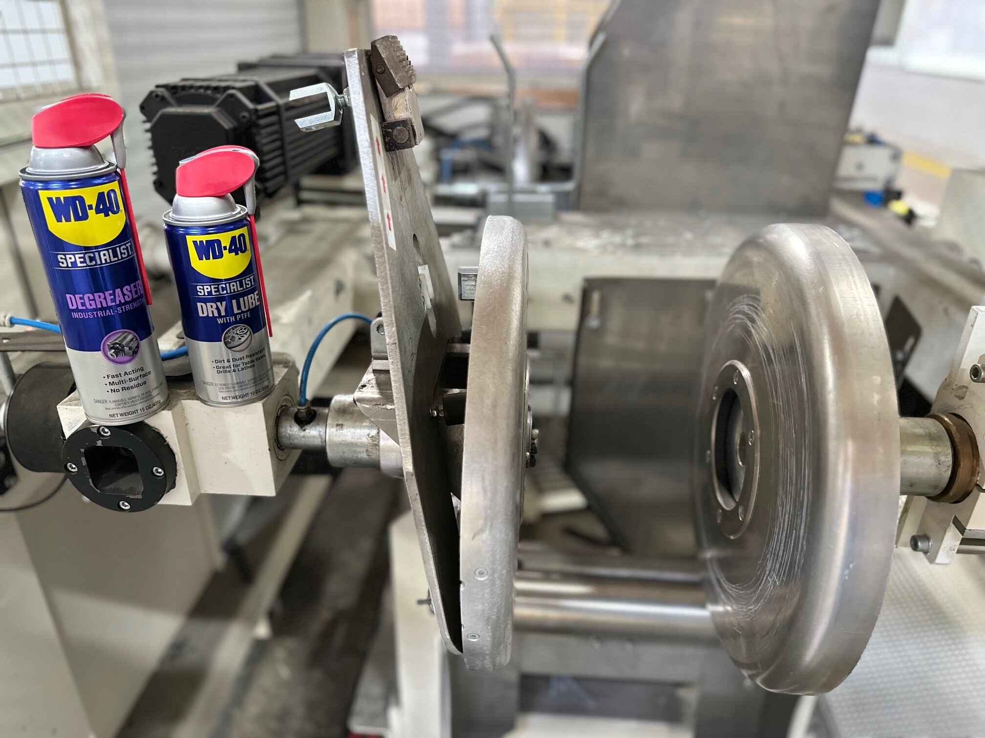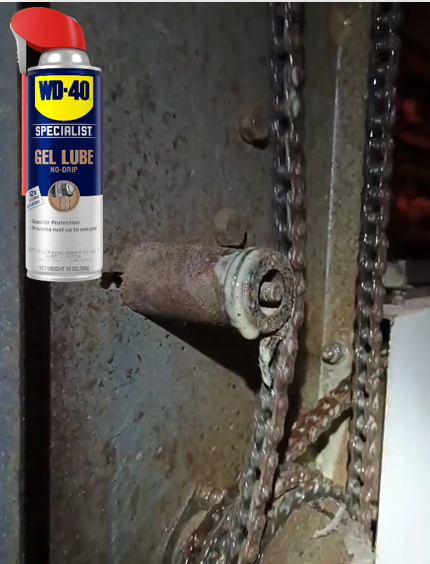 We supplied the company with complimentary samples of WD-40 Specialist Gel Lube, whose clinging formula stays in place under load and resists throw-off. It protects metal components from wear and corrosion—ideal for the farm’s continuous chains. Because these chains operate below the food line with no potential for food contact, NSF H1 registration was not required.