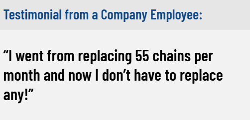 According to the company, the facility experienced frequent chain binding and breakage due to their previous lubricant failing to last in harsh, particulate heavy conditions. Maintenance crews were forcedto lubricate daily, consuming 60 gallons of productannually and replacing 55 chains per month due tobreakage, resulting in downtime, laborinefficiencies, and rising maintenance costs.
