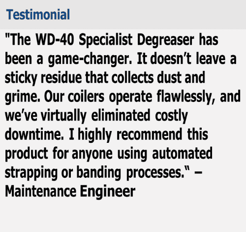 The manufacturer converted to WD-40 Specialist Industrial-Strength Degreaser, which reportedly provided superior cleaning without leaving a sticky residue. According to the manufacturer’s maintenance engineer, WD-40 Specialist Industrial-Strength Degreaser effectively: