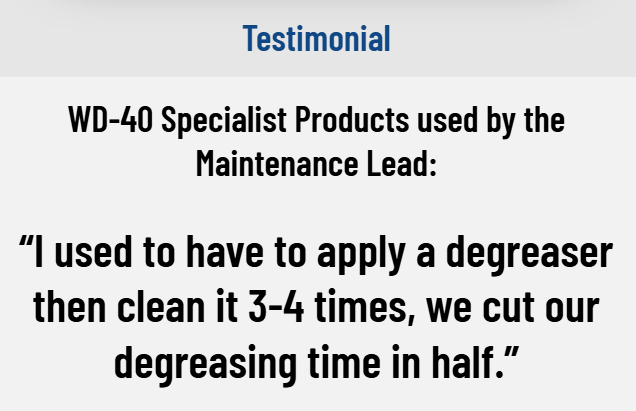The Solution: We supplied the company with complimentary samples for joint testing with maintenance and engineering teams by replacing multiple existing cleaning and lubricating products with WD-40 Specialist® products aligned to the four pillars of Preventative Maintenance. Based on an interview with the Maintenance Lead, the company reported the following results: