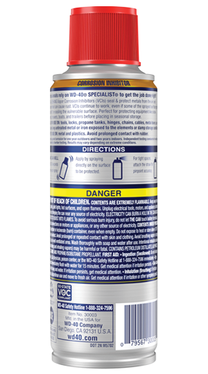 WD-40 Specialist® Corrosion Inhibitor is an anti-rust spray ideal for preventative maintenance and use in extreme environments such as high humidity. It provides non-drying protection that stays where you spray it. A must have for corrosion protection.