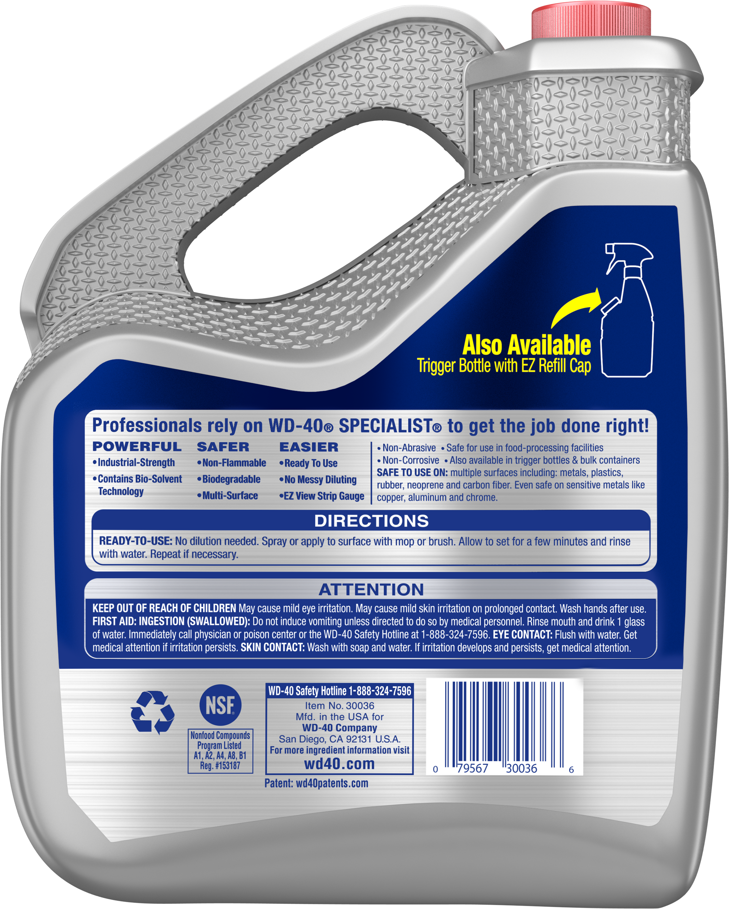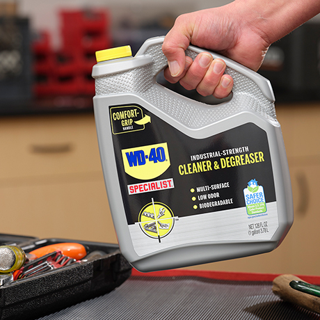WD-40 Specialist® Cleaner & Degreaser is a water-based, non-flammable, non-aerosol cleaner & degreaser with a unique bio-solvent formula engineered to be powerful yet safe for sensitive surfaces. It quickly breaks through tough grease & grime and has added corrosion inhibitors to help protect against flash rust. Great for cleaning greasy automotive parts, tools, shop floors, industrial machinery, commercial appliances and equipment. It can even be used in cleaning equipment such as power washers and ultrasonic tool cleaners as long as rinse is discharged to wastewater treatment.