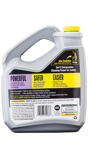 WD-40® Specialist® Industrial-Strength Cleaner & Degreaser is a water-based, non-flammable, non-aerosol cleaner and degreaser with a unique bio-solvent formula engineered to be powerful yet safe to use across sensitive surfaces. It quickly breaks through tough grease and grime and has added corrosion inhibitors to help protect against flash rust. This formula comes in 5 different sizes: 24-oz refillable trigger, 32-oz trigger, 1-gallon jug, 5-gallon jug with pour spicket, and 55-gallon drum. Great for cleaning greasy automotive parts, tools, shop floors, industrial machinery, commercial appliances and equipment. It can even be used in cleaning equipment such as power washers and ultrasonic tool cleaners as long as rinse is discharged to wastewater treatment. Safe for use on aluminum, chrome, glass, plastic, rubber, stainless steel, granite, leather, paint, and much more.
