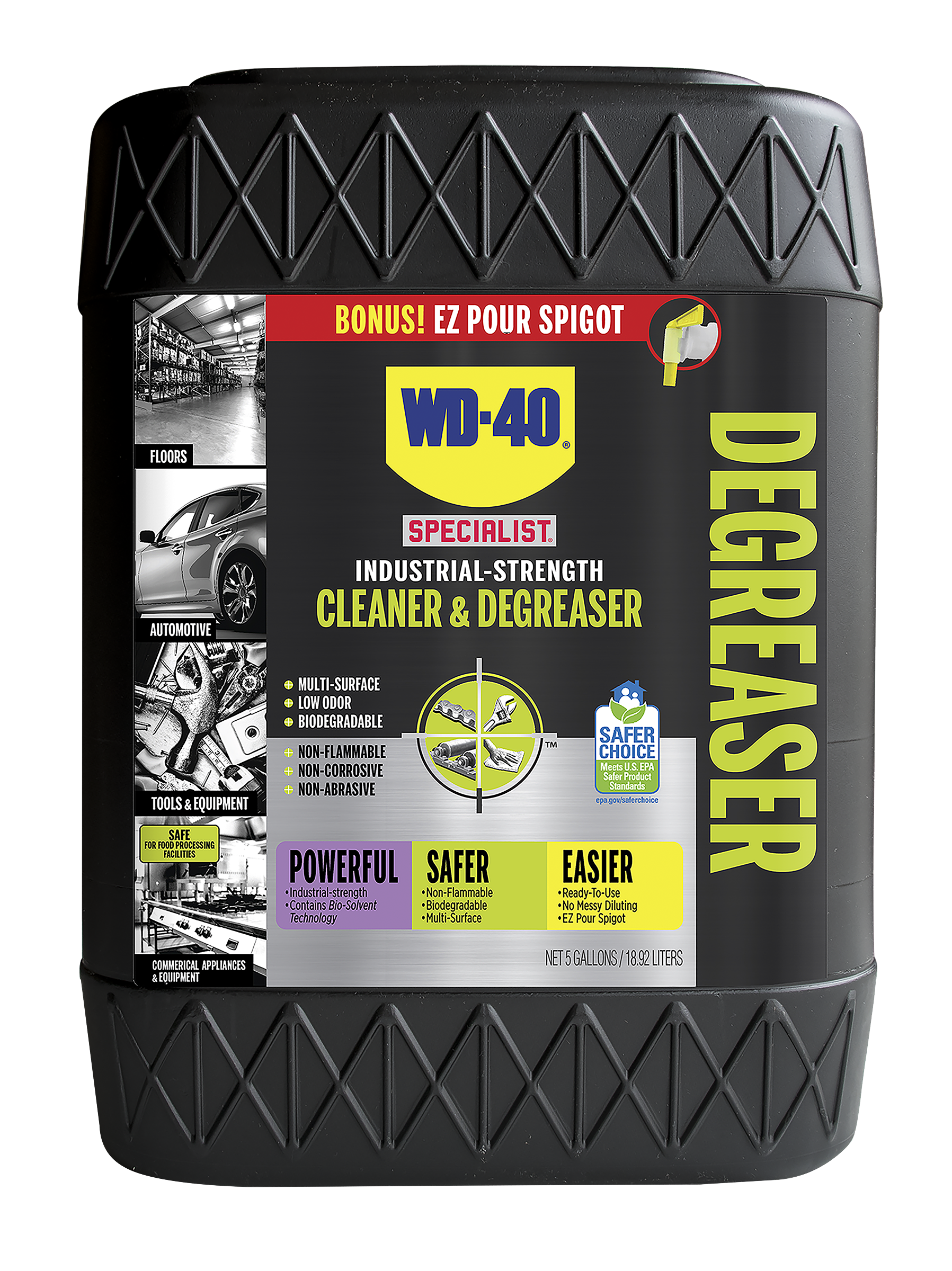 WD-40® Specialist® Industrial-Strength Cleaner & Degreaser is a water-based, non-flammable, non-aerosol cleaner and degreaser with a unique bio-solvent formula engineered to be powerful yet safe to use across sensitive surfaces. It quickly breaks through tough grease and grime and has added corrosion inhibitors to help protect against flash rust. This formula comes in 5 different sizes: 24-oz refillable trigger, 32-oz trigger, 1-gallon jug, 5-gallon jug with pour spicket, and 55-gallon drum. Great for cleaning greasy automotive parts, tools, shop floors, industrial machinery, commercial appliances and equipment. It can even be used in cleaning equipment such as power washers and ultrasonic tool cleaners as long as rinse is discharged to wastewater treatment. Safe for use on aluminum, chrome, glass, plastic, rubber, stainless steel, granite, leather, paint, and much more.